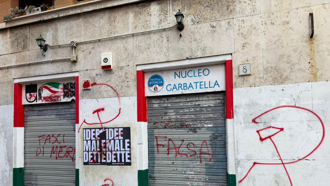 Vandalizzata la storica sede di Fratelli d’Italia della Garbatella a Roma, dove Giorgia Meloni iniziò la sua militanza nel Movimento sociale italiano, Sulle serrande della sede di via Borghese e sui muri adiacenti sono apparse le scritte “Falsa” e “Fasci di m… “con i simboli della Falce e martello in rosso, “Mani vili, con favore delle tenebre, continuano ad avvelenare il clima politico attraverso azioni teppistiche”, commenta la senatrice di Fdi Ester Mieli.